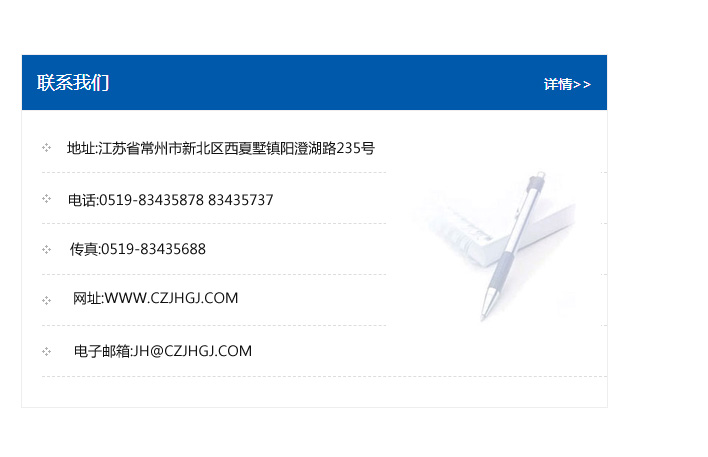 傳真:0519-83435688    郵編:213135    網址:WWW.czjhgj_com.hzlydia.com    電子郵箱:JH@czjhgj_com.hzlydia.com